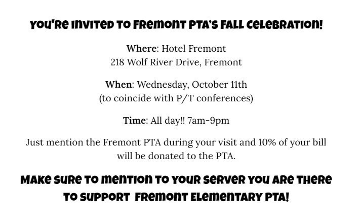 - 10/11: PTA's Fall Celebration: Hotel Fremont, all day event! See above for more information